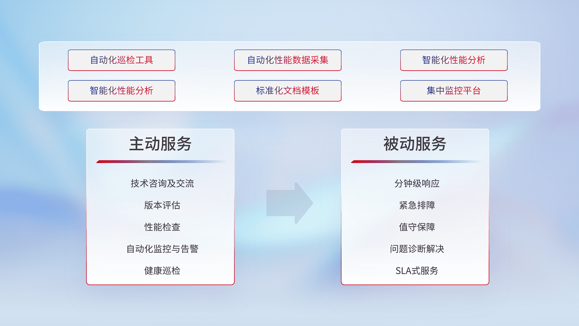 智能化工具和标准化文档,,,保障服务质量,,提供主动服务(包含技术咨询、、、、版本评估、、、、性能检查、、、自动化监控与告警、、、、健康巡检)和被动服务包含(分钟级响应、、紧急排障、、、、值守保障、、、问题诊断解决、、SLA服务)。。。